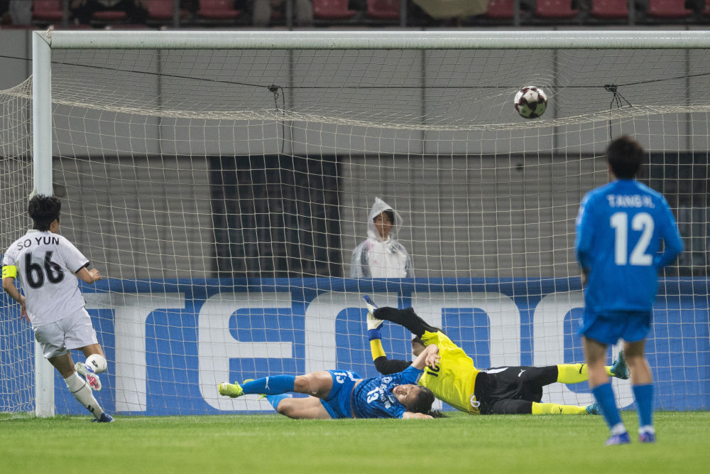 3月29日,韓國水原隊球員在進球后慶祝。新華社記者 肖藝九 攝