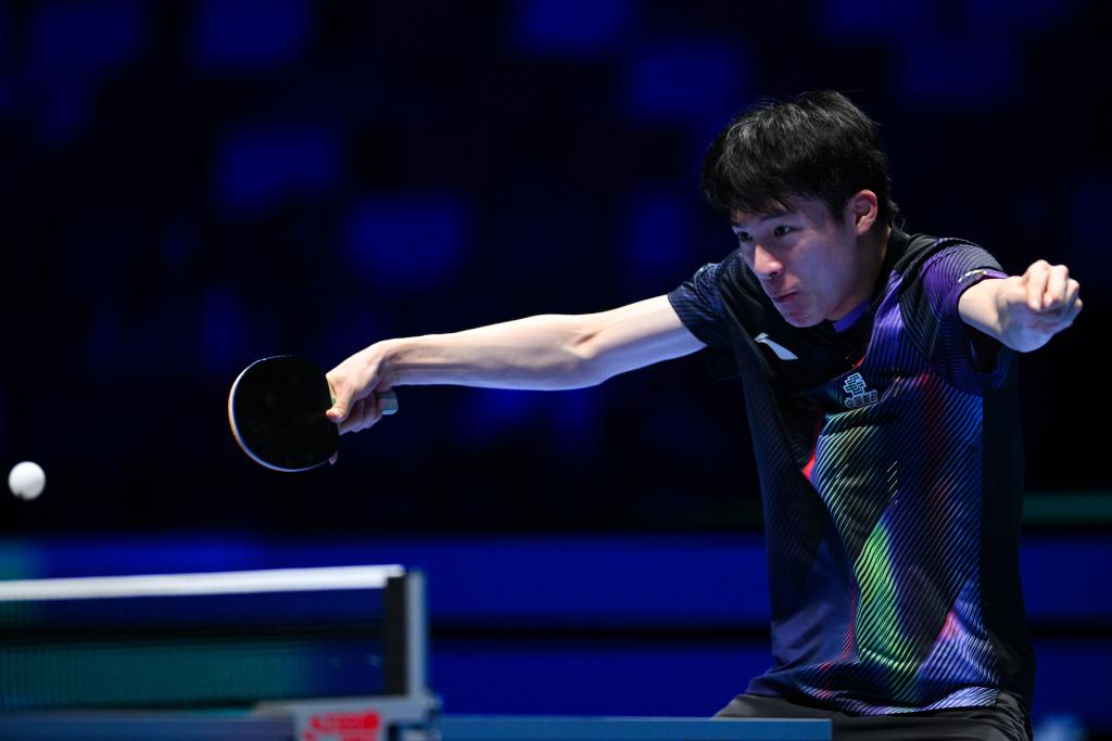 3月31日,中國(guó)隊(duì)選手王楚欽在比賽中回球。新華社發(fā)(張金加攝)