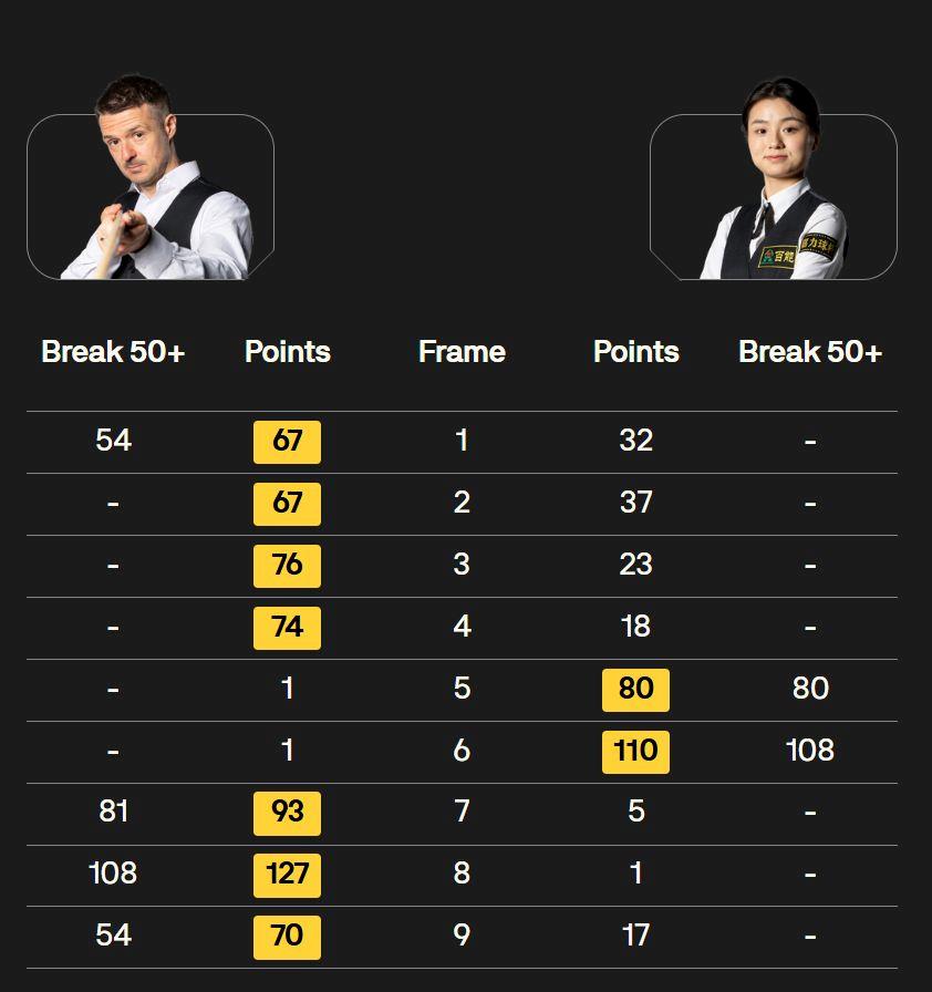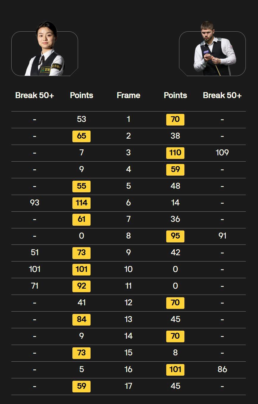 在首輪比賽中,她便以單桿101分、總比分10-7戰勝英格蘭選手丹尼爾·沃默斯利,成為首位在世錦賽資格賽長局制比賽中獲勝的中國女選手,實現了歷史性突破。