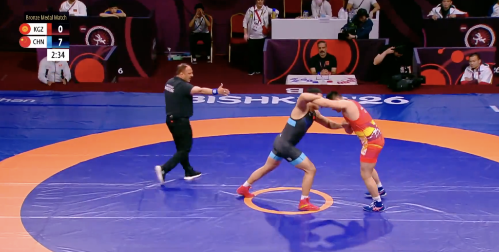 在奧運級別97公斤級銅牌賽中,王澤剛面對東道主選手梅利斯·艾特別科夫,全場打法積極主動。上半場他率先獲得跪撐進攻機會,并連續完成三次抱腰滾橋,以7:0領先進入下半場。下半場對手發起跪撐進攻時,王澤剛順勢完成轉移,并再次利用抱腰滾橋動作取得技術分,最終以11:1獲勝。